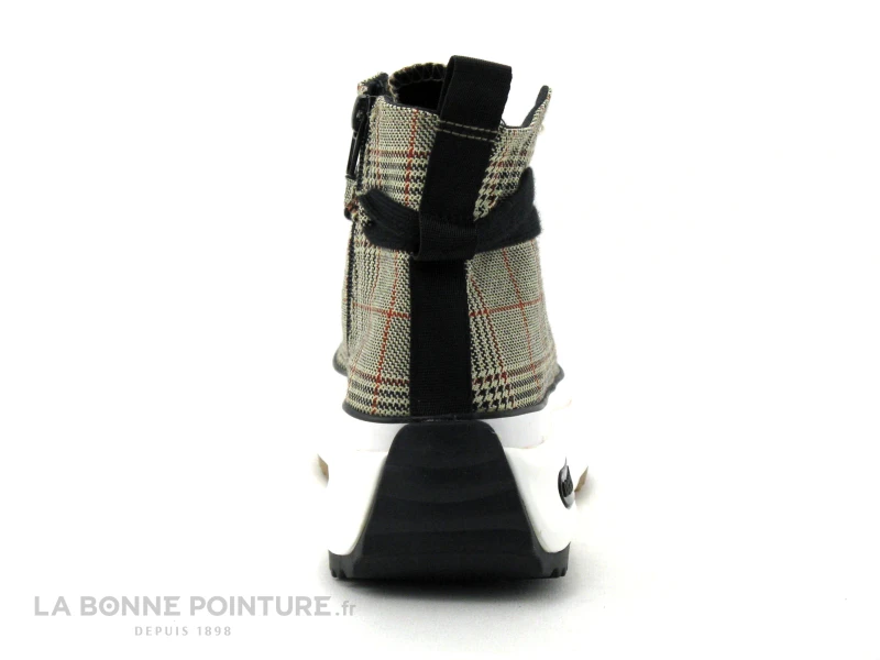Cette basket montante Femme est en toile imprimĂ©e Prince de Galles, aux tons de marron, de noir et d’orange rouille sur fond beige.