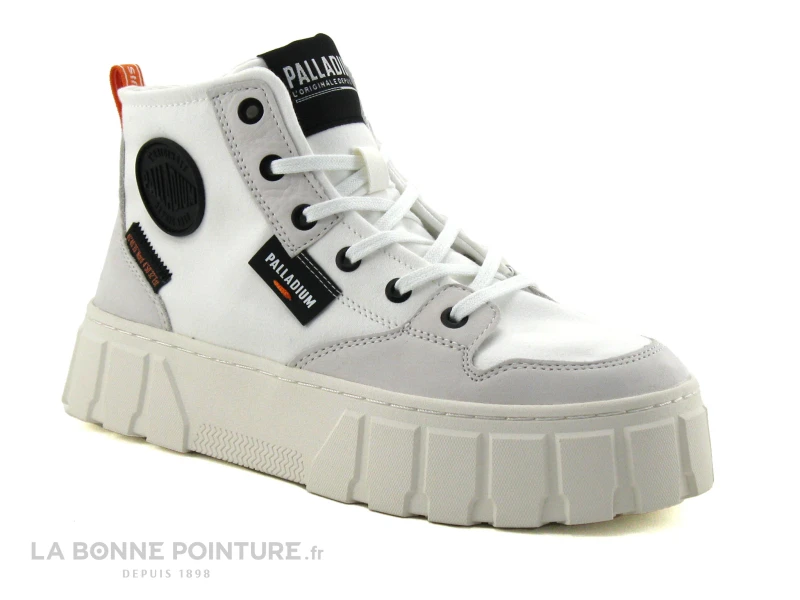 Cette basket montante Femme Palladium Pallatower associe toile blanche et cuir velouté blanc grisé.